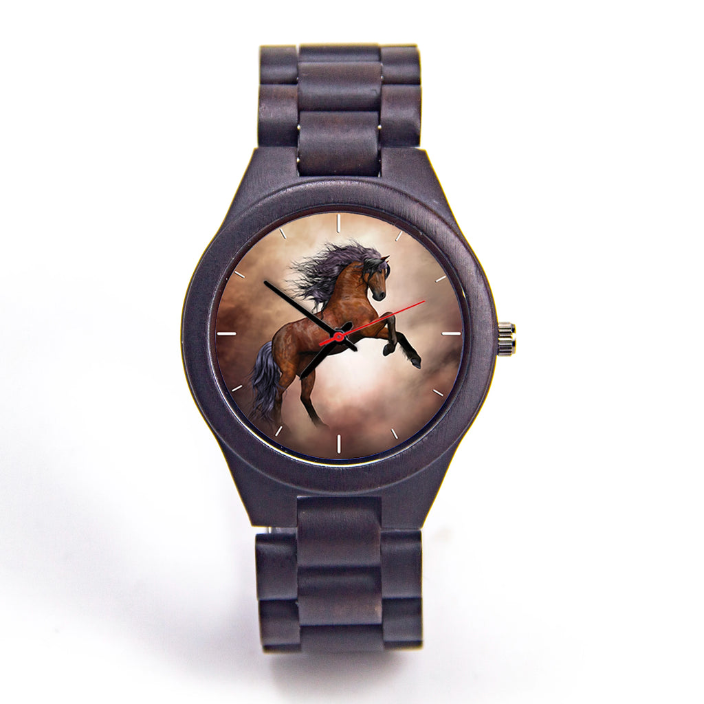 Affirmez votre connexion avec la nature grâce à cette montre ZEV LIU de la collection "Terre des Loups", une pièce d'horlogerie d'exception qui allie l'authenticité du bois à la fougue équestre. Arborant un cadran magnifié par une impression UV haute définition, elle capture l'instant puissant d'un cheval se cabrant dans une atmosphère vaporeuse et mystique. Avec son bracelet à maillons en bois véritable et ses finitions artisanales, cette montre unisex est le cadeau prestigieux idéal, offrant un style Fashion & Casual qui célèbre la liberté.
