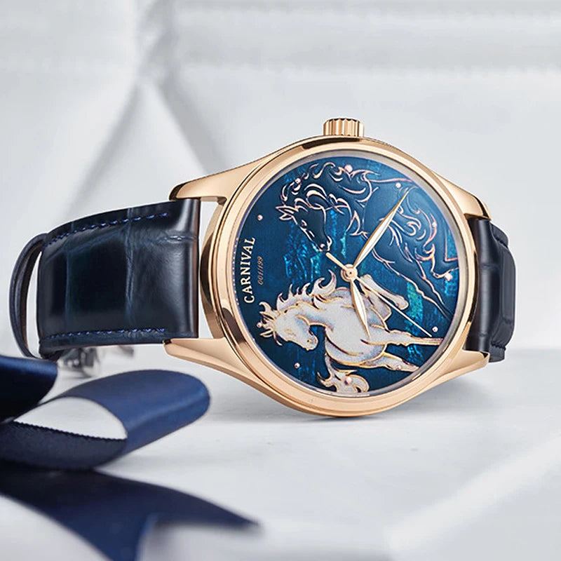 Plongez dans l'univers de la haute horlogerie avec cette pièce d'exception signée CARNIVAL. Alliant une ingénierie de précision à un design artistique captivant, cette montre automatique célèbre la noblesse du cheval à travers un cadran bleu nuit profond, où deux étalons stylisés semblent galoper parmi les constellations. Conçue pour l'homme moderne qui exige à la fois luxe et fiabilité, elle intègre un mouvement MIYOTA japonais de renommée mondiale, visible à travers un boîtier en acier inoxydable d'une finition irréprochable. C'est bien plus qu'une montre, c'est une déclaration de style prestigieuse et intemporelle.