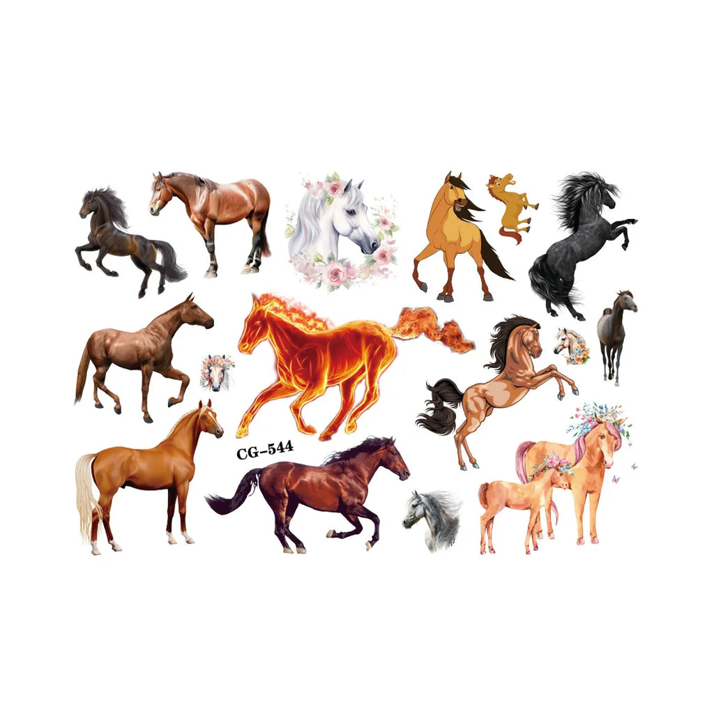 Exprimez votre passion pour l'univers équestre avec cette planche de tatouages temporaires haute définition. Alliant réalisme et élégance, ces motifs représentent des chevaux dans toute leur splendeur, des portraits détaillés aux silhouettes dynamiques. Parfait pour tester un style avant un vrai tatouage ou pour ajouter une touche sauvage à votre look lors d'un événement spécial, ce produit offre un rendu artistique saisissant. Sa grande taille permet de disposer de nombreux motifs variés sur une seule et même planche, idéale pour décorer les bras, les épaules ou les chevilles.