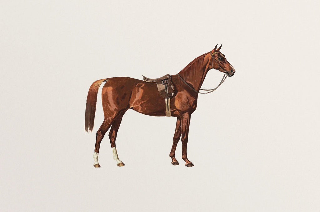 • Esthétique Équestre Classique : Un portrait de profil d'un cheval brun avec sa selle, présenté sur un fond crème épuré pour un rendu vintage et intemporel.